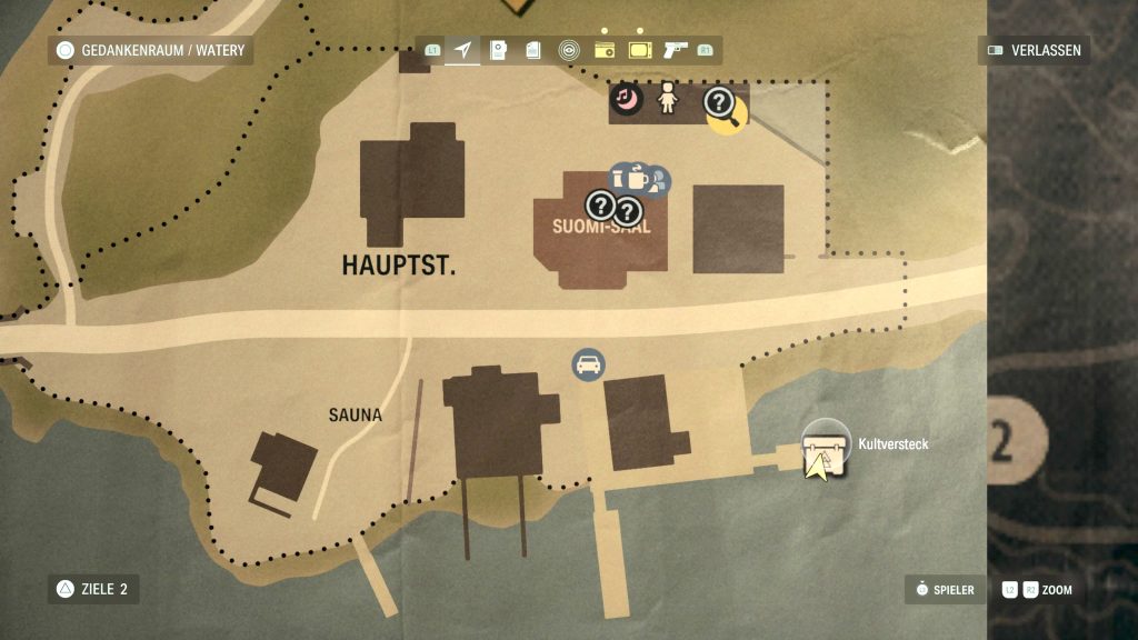 Westlich des Leuchtturms von Watery und des Schutzraums in dessen Nähe gibt es bei den Felsen einen Absatz, der euch hoch zum Kultversteck bringt. Leuchtet mit der Taschenlampe die gelben Markierungen auf den Felsen an, um die Symbole für das Truhenschloss erscheinen zu lassen. Wichtig sind nur die Dreieckssymbole und deren richtige Reihenfolge (siehe Screenshots). Die anderen geometrischen Formen sind falsch.