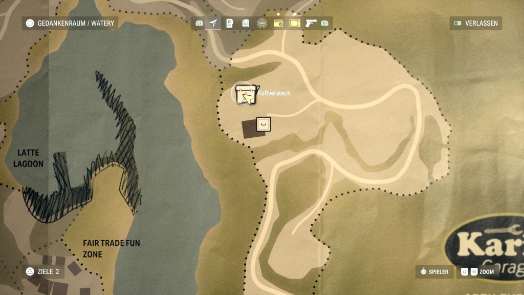 Im Zentrum von Watery gibt es ein Kultversteck, dass ebenfalls erst nach dem Kampf gegen Mulligan und Thornton erreichbar wird. Die Truhe befindet sich auf einem Holzsteg im Osten beim Dock und hinter einigen blauen Boxen. Die Lösung des Matherätsels bzw. die richtige Kombination für das Zahlenschloss des Kultverstecks ist: 496.