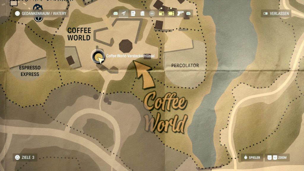 Das Vorhängeschloss an der Truhe in der Umgebung des Brunnens im Freizeitpark benötigt einen passenden Schlüssel. Der Coffee World-Versteckschlüssel befindet sich laut Hinweis auf der Truhe hinter der Kaffeekannenfigur beim Pavillon mit der Lichtzuflucht.