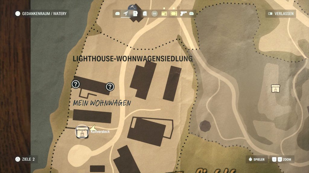 Sobald die Überschwemmung in der Lighthouse-Wohnwagensiedlung nach dem Sieg über Kultisten-Bosse Mulligan und Thornton zurückgegangen ist, kann das Kultversteck südlich von Sagas Wohnwagen erreicht werden. Allerdings ist auch diese Truhe mit einem Vorhängeschloss versehen, das den richtigen Schlüssel benötigt. Es gibt einen Hinweis, der zum Schlüssel führt.