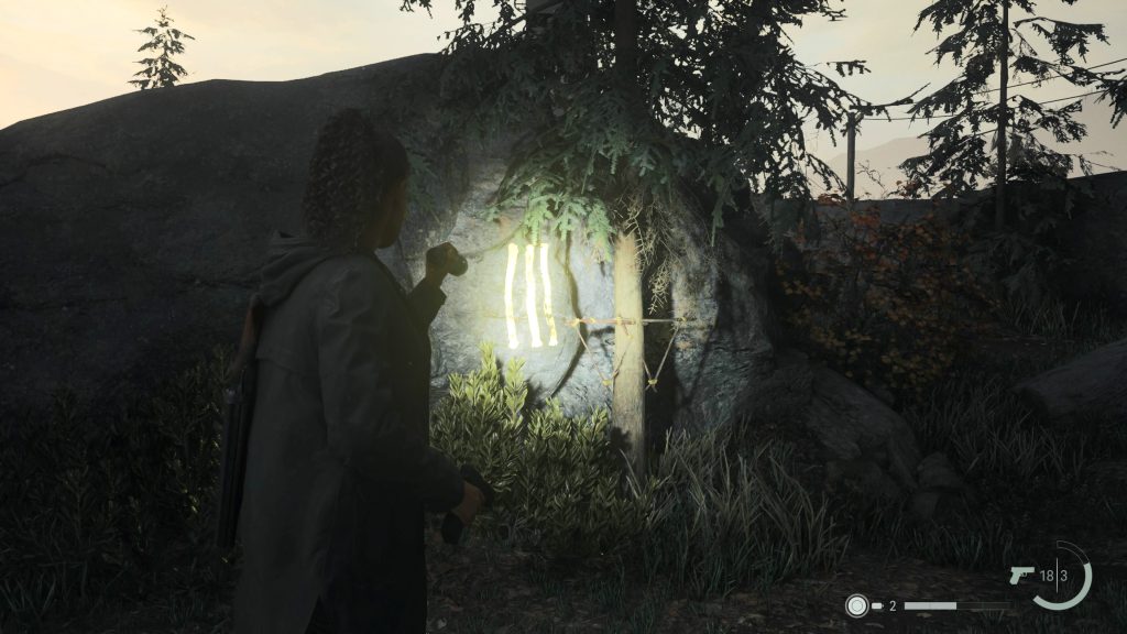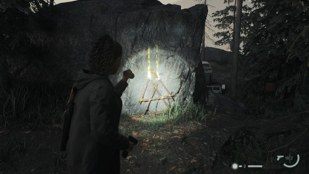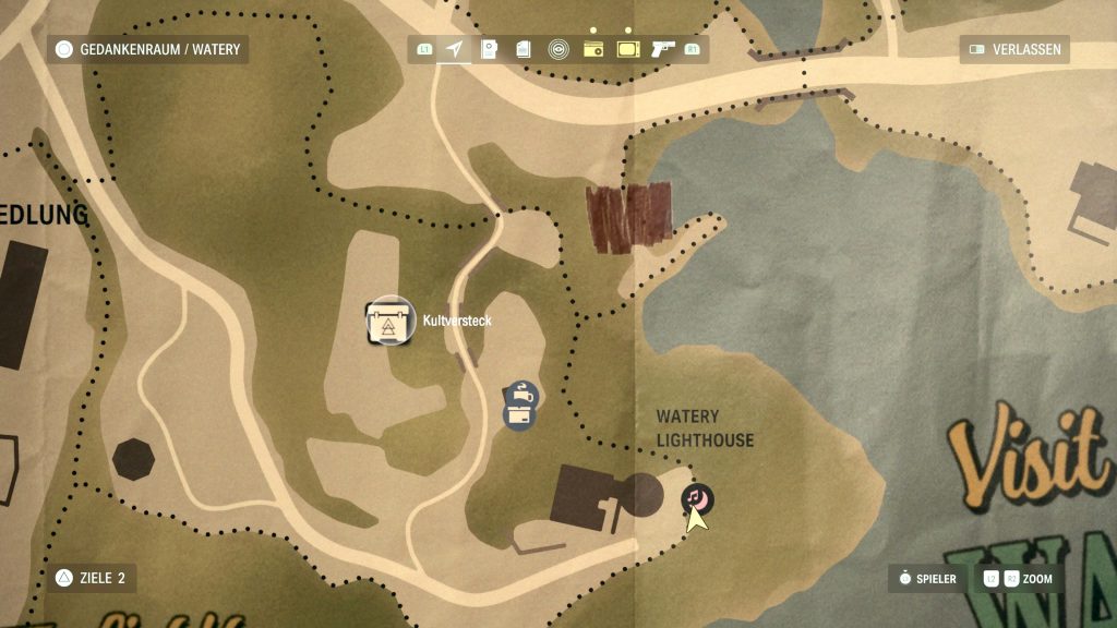 Westlich des Leuchtturms von Watery und des Schutzraums in dessen Nähe gibt es bei den Felsen einen Absatz, der euch hoch zum Kultversteck bringt. Leuchtet mit der Taschenlampe die gelben Markierungen auf den Felsen an, um die Symbole für das Truhenschloss erscheinen zu lassen. Wichtig sind nur die Dreieckssymbole und deren richtige Reihenfolge (siehe Screenshots). Die anderen geometrischen Formen sind falsch.
