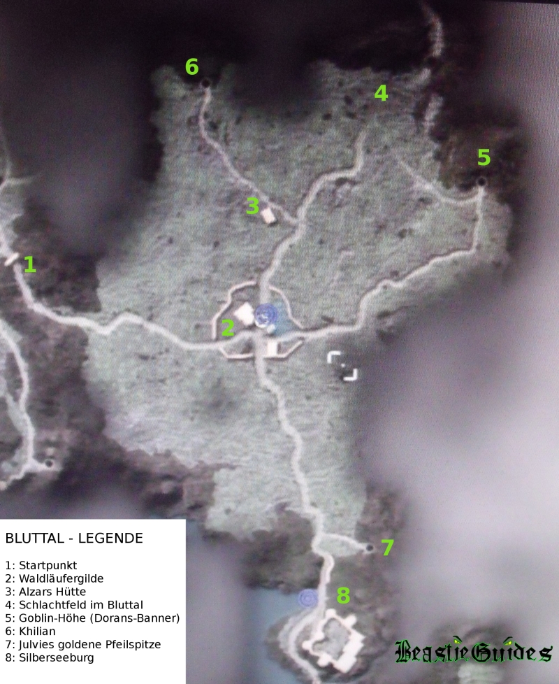 Verlasst die Waldläufergilde im Norden in Richtung Thorniara. Ein paar Meter außerhalb der Siedlung winkt bei der Hütte von Alzar die nächste Nebenquest „Die geheime Zutat“, in der ihr Totenmorcheln vom Schlachtfeld im Norden des Bluttals sammeln sollt. Dafür winkt am Ende das Rezept für den verbesserten Manatrank. Das Schlachtfeld habt ihr nach einigen Metern erreicht. Hier trefft ihr auf zwei Personen. Der Großmeister der Waldläufergilde Craglan vermisst seinen Sohn Khilian, den ihr in der Nebenquest „Der verschollene Soldat“ aufspüren könnt. Sprecht schließlich Doran an, der noch immer die Standarte auf dem Schlachtfeld sucht. Wie üblich müsst ihr wieder die Dinge ins Lot bringen. Die Goblins im Nordosten sollen die Standarte gemobst haben. Sucht im Südosten des Schlachtfeldes nach dem kleinen Trampelpfad in die Büsche. Er führt euch direkt zur Goblin-Höhle (5). Wenn ihr Schwierigkeiten habt, die Höhle zu finden, dann beginnt in der Waldläufergilde beim Ausgang zur Alten Höhle. Begegnet hr den ersten Goblins des Leichenfresser-Stamms , seid ihr auf dem richtigen Weg.