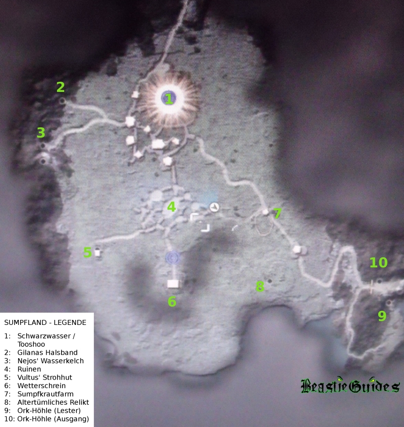 Wenn ihr für Gilana tätig werden wollt, müsst ihr sie noch einmal ansprechen. Ihr müsst ihr ein magisches Halsband aus einer Höhle (2) bergen. Verlasst Schwarzwasser über den Westzugang. Biegt bei der ersten Gelegenheit bei der Gabelung nach rechts ab, wo ihr wenige Meter weiter eine Höhle entdeckt. In der Höhle wimmelt es von Waranen, mit denen ihr aber mittlerweile gut zurecht kommen solltet. Folgt dem Tunnel, bis ihr nach unten springen müsst. Biegt ihr hier zuerst in den rechten Stollen, erreicht ihr eine Höhle mit einer verschlossenen Truhe, die unter anderem den „Ring des Mystikers“ birgt. Eine echte Bereicherung für jeden Magekundigen.