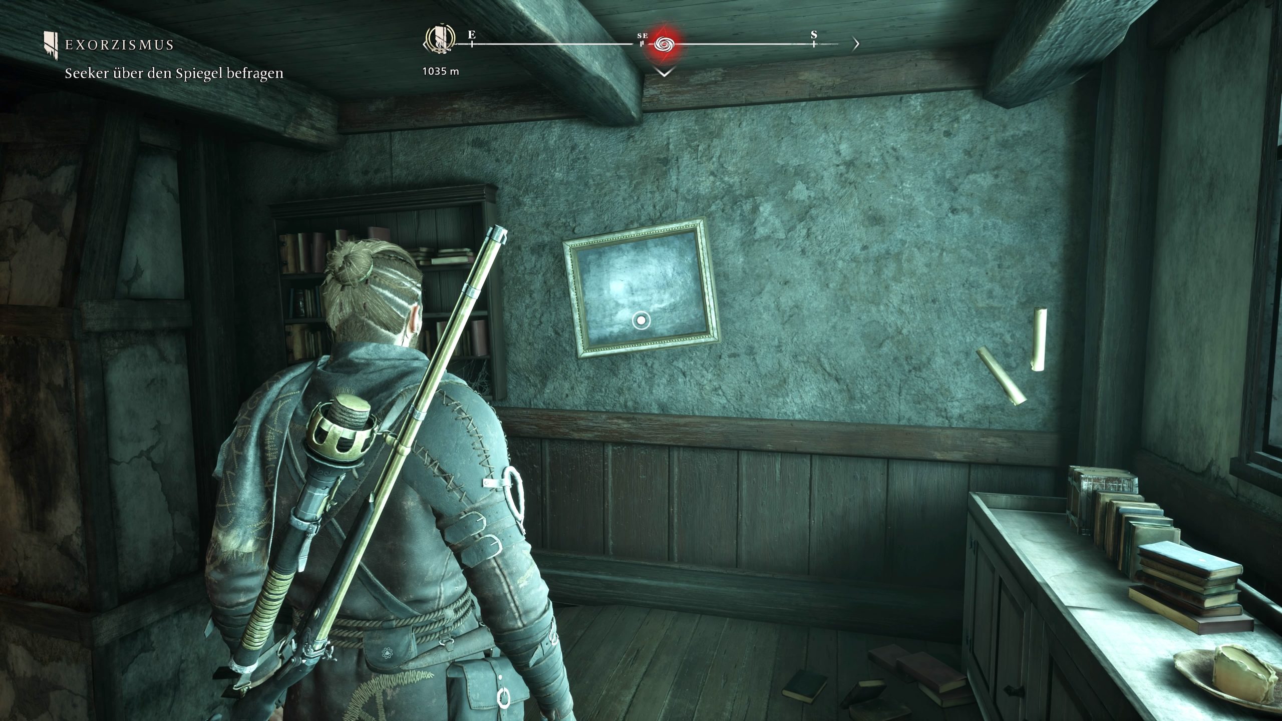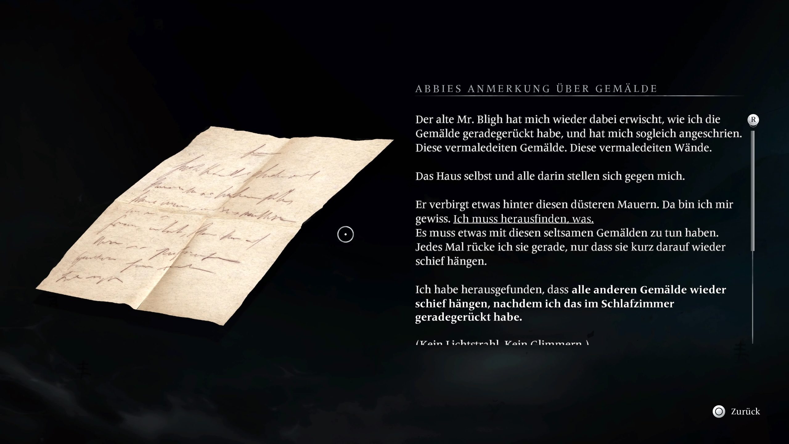 Auf das Puzzle oder Rätsel mit den schief aufgehängten Bildern werdet ihr während der Spukermittlung „Wie durch ein dunkles Glas“ aufmerksam. In der Quest macht ihr die Zimmer durch die Beseitigung des korrupten Efeus wieder betretbar. Dabei findet ihr die Notiz „Abbies Anmerkungen über Gemälde“ im OG am Ende des Gangs auf dem Schreibtisch mit dem Spinnrad.