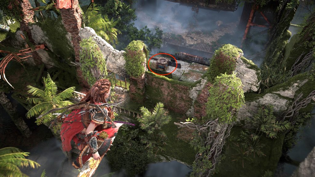 Auf dem Metallsteg steht eine Kiste, die ihr mit dem Zugwerfer nach unten auf den Boden zieht oder sie zu Boden fallen lasst. Schiebt die Kiste nach Westen und lasst sie ins Wasser fallen. Springt dann selber ins Wasser und geht auf die andere Seite. Benutzt dort den Zugwerfer, um die Kiste aus dem Wasser wieder an Land zu ziehen. Jetzt schiebt ihr die Kiste weiter nach Westen, bis sie bei einem Absatz etwas nach unten fällt und ihr eine große Tür mit einem dunklen Raum dahinter erkennt: der Aufzugsschacht.