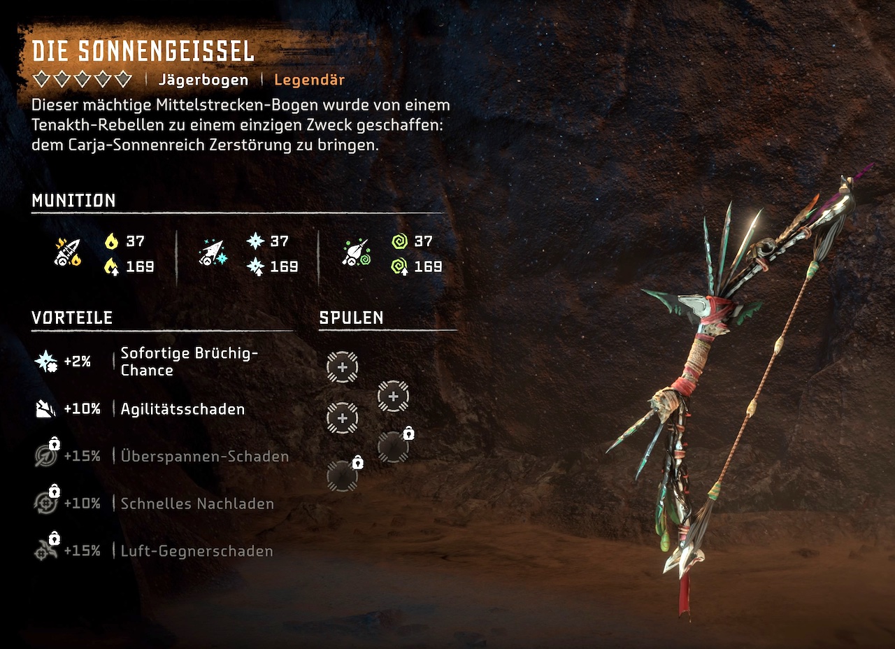 Besiegt ihr schließlich Asera, könnt ihr bei ihren Überresten den legendären Jägerbogen „Die Sonnengeißel“ finden. Dieser Bogen ermöglicht euch den Angriff mit drei unterschiedlichen Elementen Feuer, Frost und Säure mit nur einer Waffe. Schließt bei Erend die Quest ab und kassiert die Erfahrungspunkte. Zeit zu gehen.