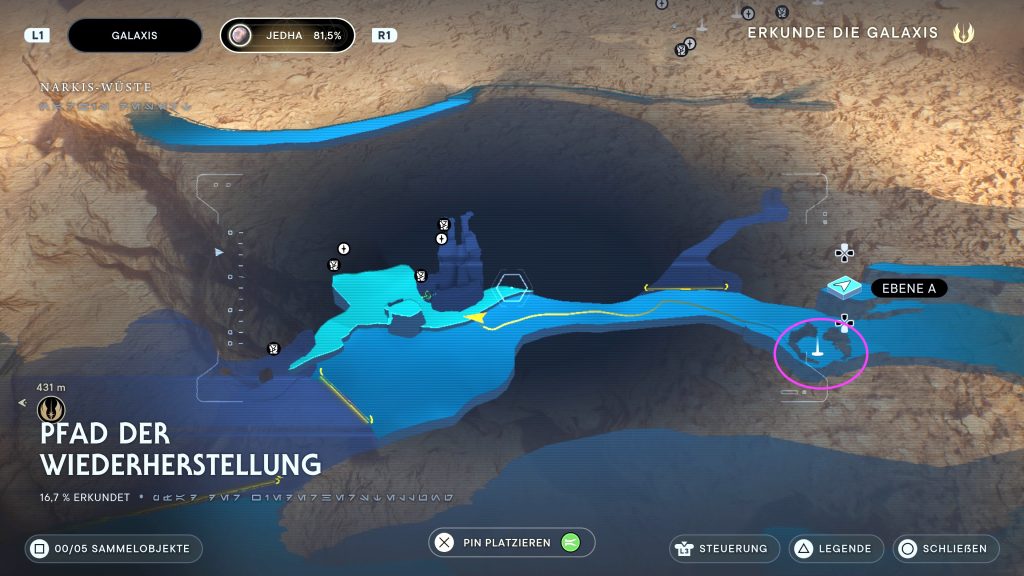 Startpunkt für den Pfad der Wiederherstellung auf Jedha ist der Meditationspunkt Wüstenkamm in der Narkis-Wüste. Ruft ein Spamel herbei und reitet zur Ruine. Der Pfad gehört zum Grab des Wegfinders. Absolviert alle drei Pfade, um das Grab im Zentrum der Narkis-Wüste betreten zu können. Vielleicht lauft ihr ein paar Vertretern der Haxion-Brut direkt in die Arme, während ihr euch in der Umgebung des Bauwerks umschaut.