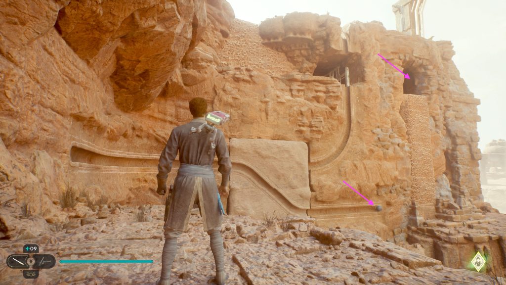 Die zum Pfad der Wiederherstellung gehörende Kugelanlage und das Gebäude selbst befinden sich erhöht auf mehreren Plateaus. Irgendwie müsst ihr es also auch nach oben schaffen. Seht euch am Anfang nach dem tafelbergartigen Hügel in der Umgebung um. An dessen Seite befinden sich Grifflöcher, mit denen Kal nach oben auf das Plateau des Hügels klettern kann (siehe Screenshot). Oben angekommen seht ihr einen Stormtrooper mit schwerem Geschütz.