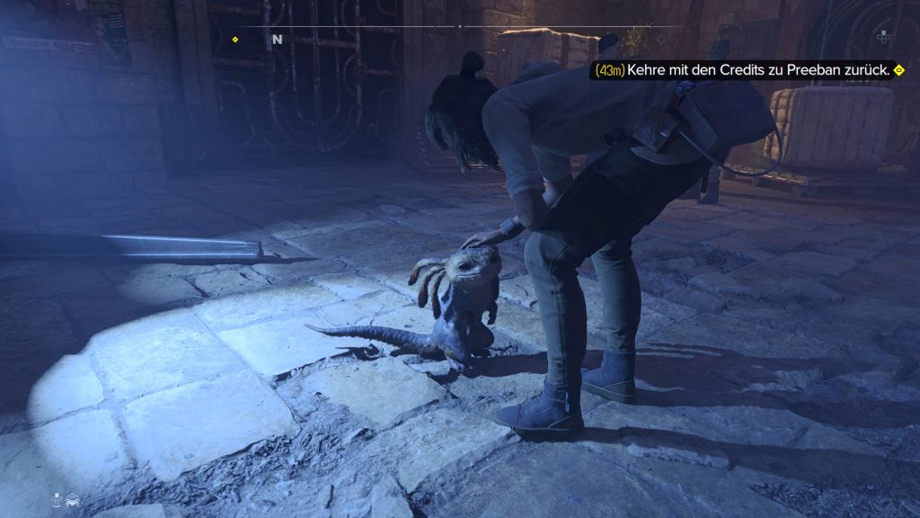 Geht also nach draußen ins Arbeiterviertel von Canto Bight und seht euch etwas um. Je weiter ihr in den folgenden Hauptquests vorankommt, desto mehr werden von den Gameplay-Features und von Kays Fähigkeiten verfügbar. Schaut auf den Kompass und geht mit dem kaputten Datenstift zu Preebans Werkstatt. Der Techniker will allerdings für seine Arbeit mit 50 Credits bezahlt werden.