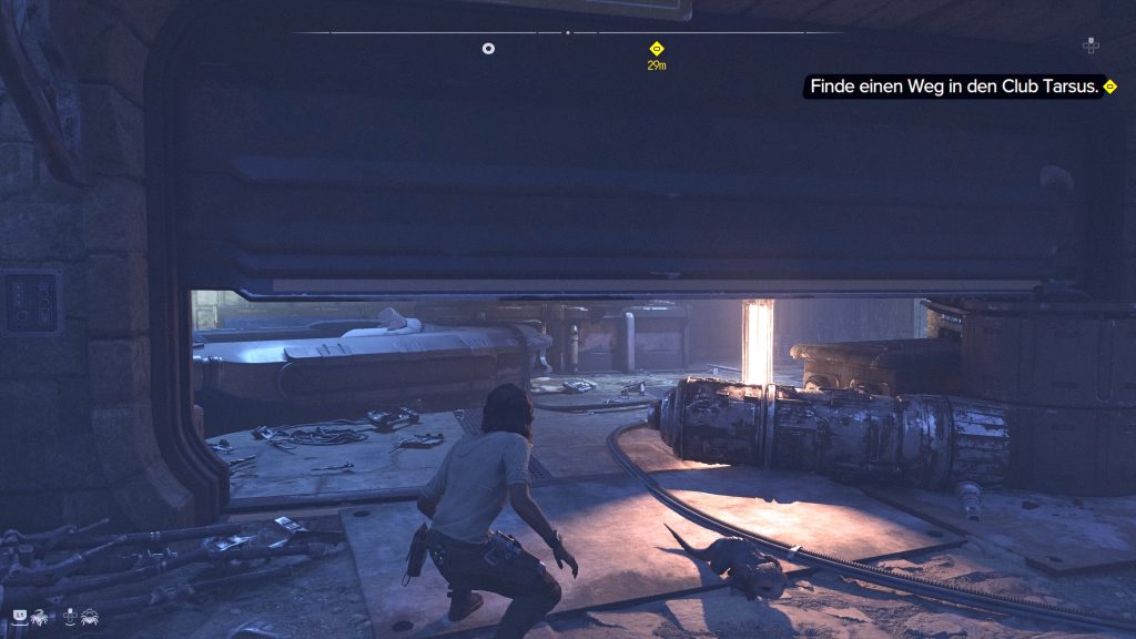 Aber ohne eine glaubwürdie falsche Identität kann Kay den Planeten nicht verlassen. Mit dem gerade reparierten Datenstift begebt ihr euch als Nächstes zum Club Tarsus im Arbeiterviertel. Der Kompass weist euch den Weg. Vom Haupteingang mit den abweisenden Türstehern geht ihr nach links, wo ihr ein halb geschlossenes Garagentor erreicht. Duckt euch und geht unter dem Garagentor hindurch. Ihr gelangt so zu einer Konsole für den Datenstift, um mit dem Mini-Game die Tür daneben zu öffnen.