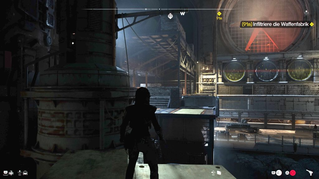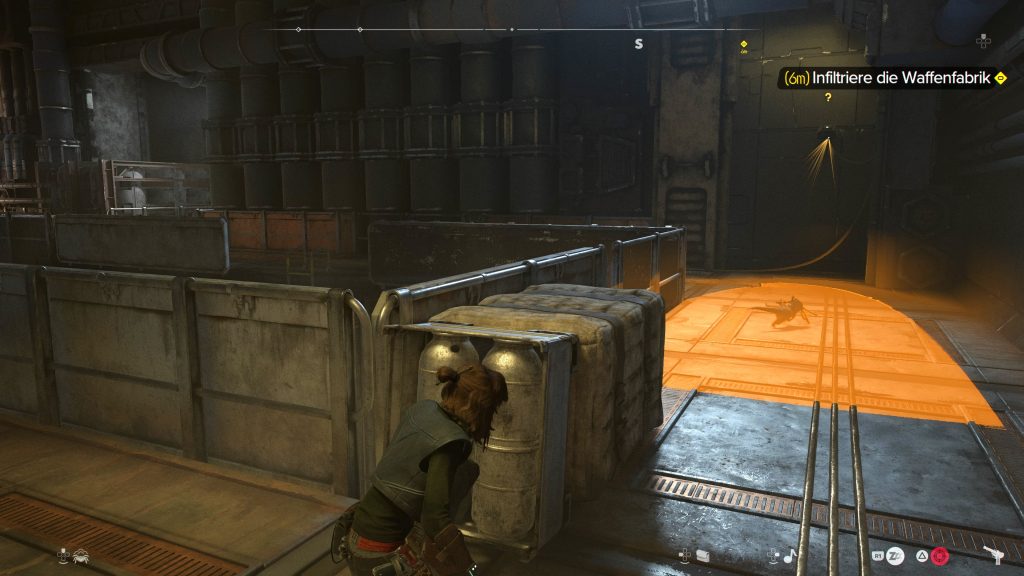 Ihr dagegen verlasst den Bereich über den Lastenaufzug in der Nähe. Es folgt eine längere Phasemit Kämpfen gegen Ashiga-Wachen. Nutzt die überall herumstehenden explosiven Kanister. Am Ende verlasst ihr die Waffenfabrik auf demselben Weg, wie ihr gekommen seid.