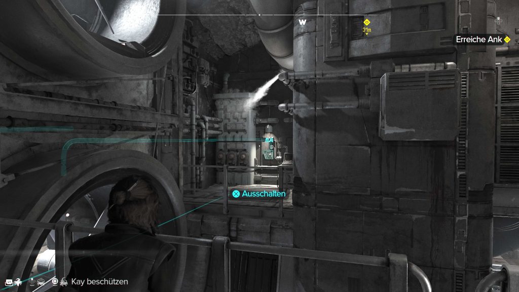 Wenn ihr die Röhre wieder verlassen habt, neutralisiert ihr den Söldner im Raum. Jetzt könnt ihr schon einen Blick durch ein Fenster auf Ank werfen. Um diesen Raum zu verlassen, muss der sich drehende Ventilator gestoppt werden. Neben dem Fenster könnt ihr am gelben Metallgitter hochklettern. Klettert dann nach links weiter, wo ihr noch einmal die Richtung umkehrt. Springt am Ende ab, ihr steht dann direkt vor zwei Turbinen. Dreht euch um.