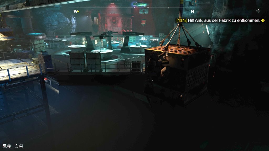 Nach ein paar Meter kommt ihr auf der anderen Seite des Gitters von vorhin wieder raus. Springt als Nächstes bei der Truhe runter auf die gelben Metallplatten, um die Griffhaken auf der gegenüberliegenden Seite zu erreichen. Ihr erreicht eine Bodenluke und durchquert wieder eine Belüftungsröhre. Dreht euch in der Metallröhre um. Es gibt hier eine versteckt gelegene Truhe.