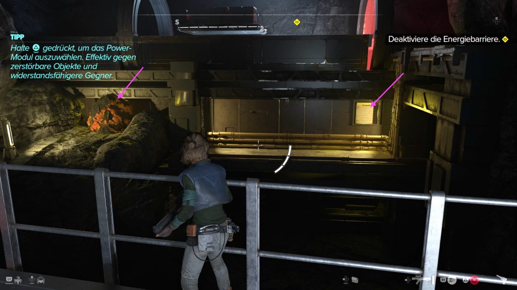 Schaltet auf das Power-Modul von Kays Blaster um, damit ihr den Fels mit einem aufgeladenen Schuss sprengen könnt. So wird der Kondensator dahinter freigelegt. Schaltet den Blaster in den Ionen-Modus und zerstört so den ersten Kondensator. Schickt nun Nix zur Rolltür auf der rechten Seite, um sie zu öffnen. Jetzt könnt ihr auch den zweiten Kondensator mit einem Ionen-Schuss treffen. Daraufhin wird das rote Kraftfeld deaktiviert, Ank kann weiterfahren.