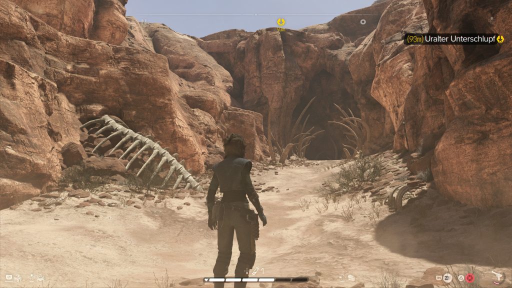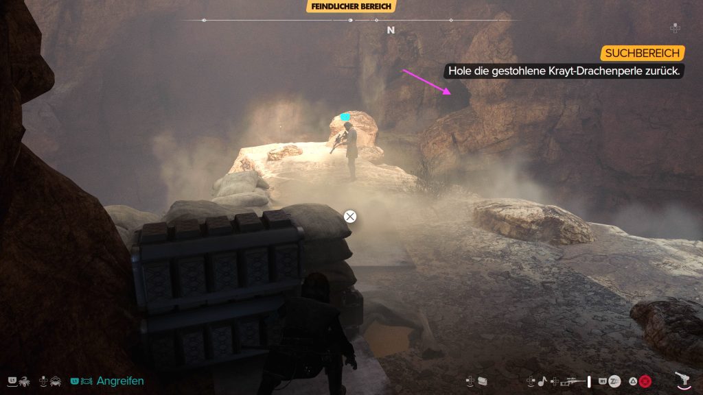 Benutzt die Greifhaken und die Kletterfelsen in der Höhle, um die große Truhe weiter unten zu plündern. Oben auf der Spitze des Kletterfelsens geht es weiter und tiefer in die Höhle hinein. Quetscht euch durch die Engstelle. Neben der Engstelle könnt ihr noch eine Truhe plündern, falls ihr schon das Power-Modul für Kays Blaster aktiviert habt. Nach der Engstelle erreicht ihr den Teil des Banditenlagers, in dem sich die Krayt-Drachenperle befindet.