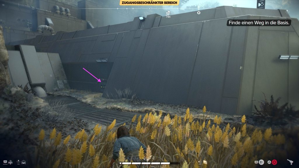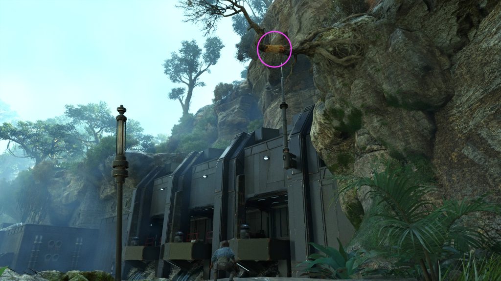 Die erste Variante beginnt auf der Anhöhe auf der rechten, östlichen Seite der Anlage bei den großen Wasserrohren und dem Wasserbecken (siehe Screenshot oben links). Ein schmaler Pfad führt von der Anhöhe bis zu einem Ankerpunkt für den Greifhaken an einem dicken Ast. Hier könnt ihr euch über das Becken schwingen, um die Basis zu betreten. Dies ist der Weg, den wir für unserer Lösung gewählt haben. Den alternativen Zugang in die Basis findet ihr etwas weiter unten.