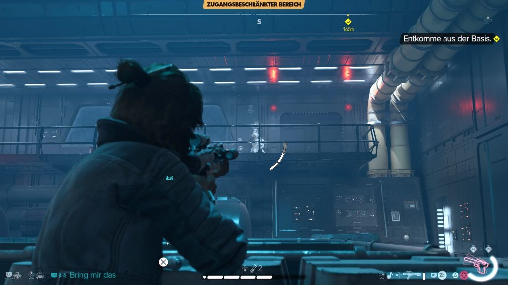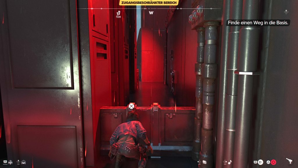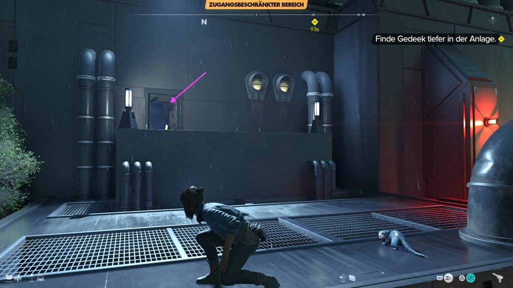 Seid ihr in der Station über die Wasserrohre eingedrungen, lauft ihr geradeaus weiter, bis ihr nach unten in Richtung des Hofs springen könnt. Lasst die Leiter nach unten ausfahren und klettert nach unten. Duckt euch im Hof, wenn die Wachen in eure Nähe kommen. Nutzt den kleinen rot ausgeleuchteten, engen Korridor im Hof mit den Metallbehältern, der euch vor der Entdeckung durch die Wachen gut schützt.