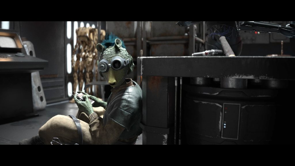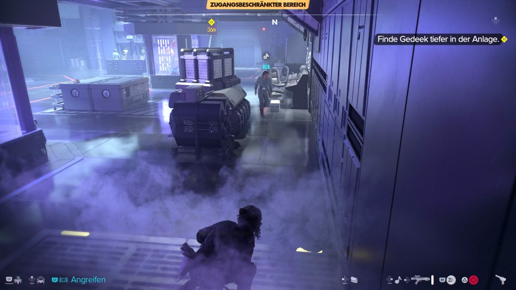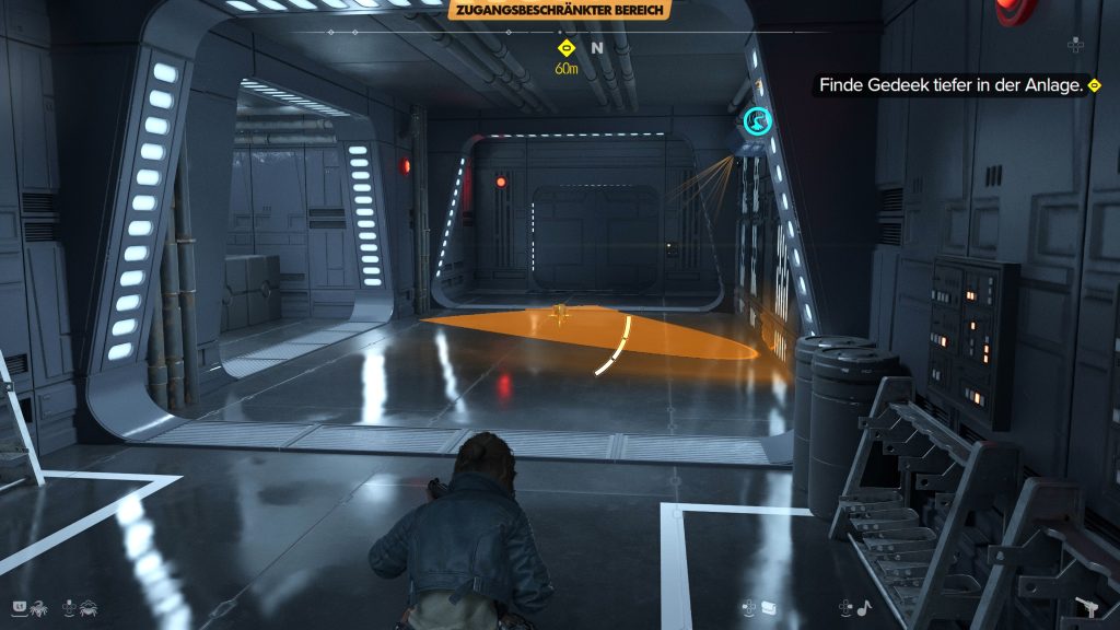 Wartet bis sich die Kamera bis zum Ausgang am Ende des Korridors gedreht hat, um dann mit Nix ein Ablenkungsmanöver zu starten. Ihr könnt dann unbemerkt von den Stormtroopern und der Kamera bis zur Tür am Ende des Korridors schleichen. Im nächsten Raum überwältigt ihr den Techniker am Computer.