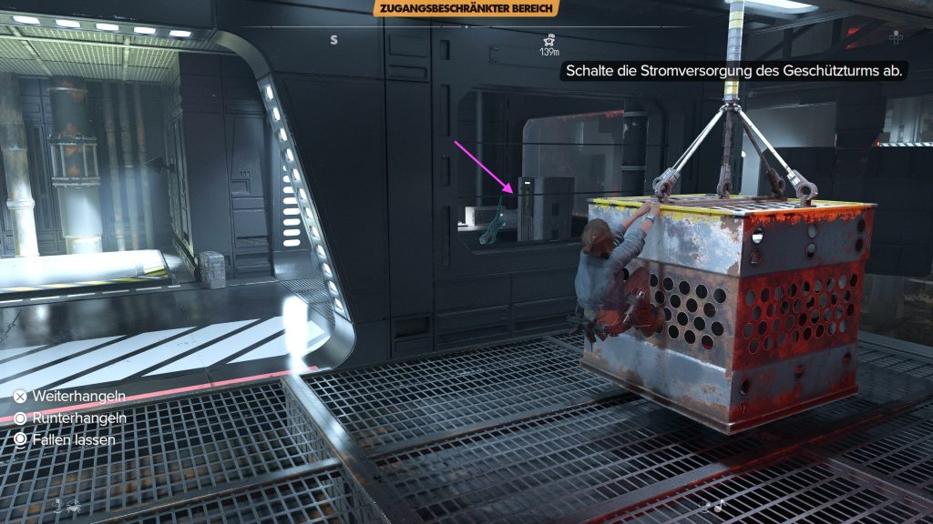 Sucht nach dem Turbolift im Korridor den Lüftungsschacht und krabbelt durch die Eingeweide der Anlage. Ein paar Sprünge mit dem Greifhaken später erreicht ihr den nächsten Lüftungsschacht und eine Halle mit einem aktiven Geschützturm. Bevor ihr hier lebend weiterkommt, müsst ihr den Geschützturm ausschalten. Lauft dazu in Richtung der roten Energiebarriere und geht unterwegs hinter den verschiedenen Schutzmöglichkeiten vor den Laserschüssen in Deckung.