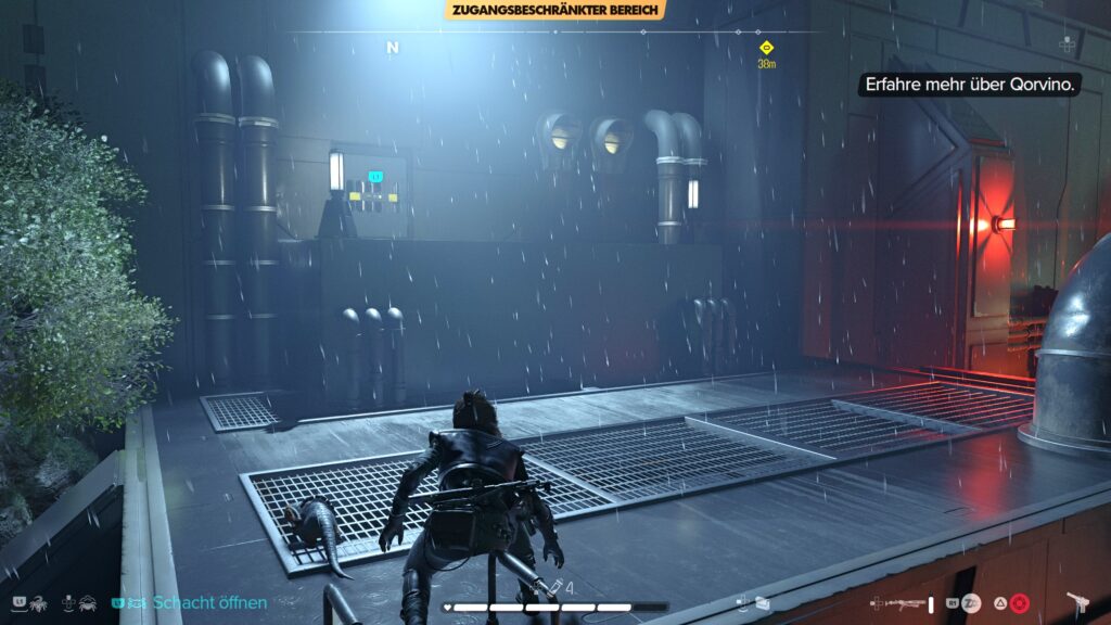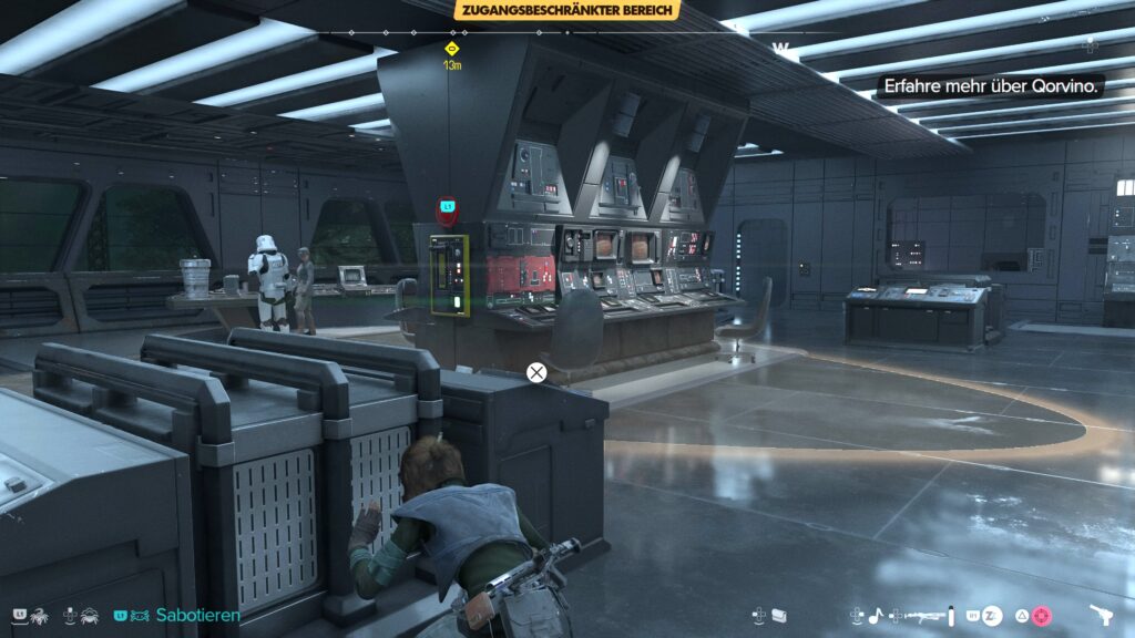 Für diese Quest empfiehlt sich der Zugang über den Lüftungsschacht auf der linken, westlichen Seite der Anlage. Das ist der kürzeste Weg zur gesuchten Information. Schleicht euch dort durch das Gebüsch an den Viper-Droiden vorbei und schlüpft in den Schacht am Fuß der Basis. Ihr erreicht auf der anderen Seite den Hof mit ein paar Imps. Die Daten über Qorvino befinden sich im Inneren im Kontrollraum mit den großen Fenstern auf der ersten Etage.