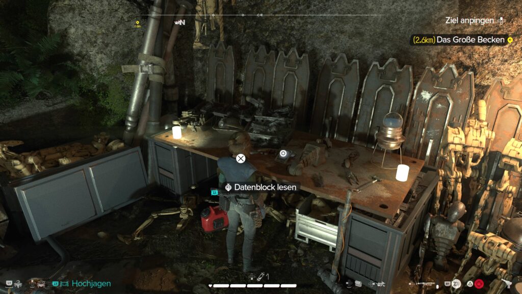Der gesuchte Hinweis bzw. der Datenblock „Tschuldigung und tschüss“ liegt auf dem improvisierten Schreibtisch mit der Metallplatte in der Höhle (siehe Screenshot oben). Lest den Datenblock nicht sofort, sondern checkt Waffen, Gesundheitszustand und Bakta-Vorräte vorher: nach dem Lesen tauchen weitere Piraten im Versteck auf.
