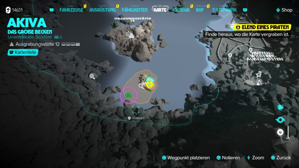 Am Ende des Lagers angekommen, klettert ihr die Steine der Tempelruine nach oben. Auf der Spitze befindet sich ein kleines Camp mit mehreren Datenblöcken. Der Datenblock „Von eurem alten Käpt’n“ enthält eine Karte mit einer markierten Stelle auf einer kleinen Insel im Großen Becken (siehe Screenshot unten). Zerstört die Wand in der Nähe des Datenblocks mit dem Blaster im Power-Modus. So schafft ihr einen Hinterausgang aus dem Lager, wo ihr euch abseilen mit dem Greifhaken könnt.