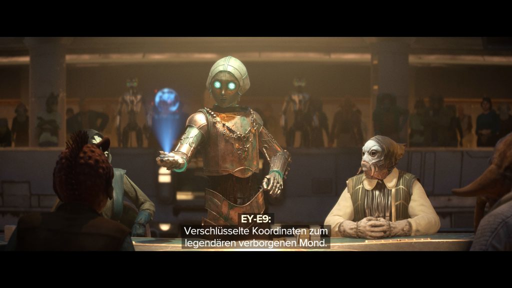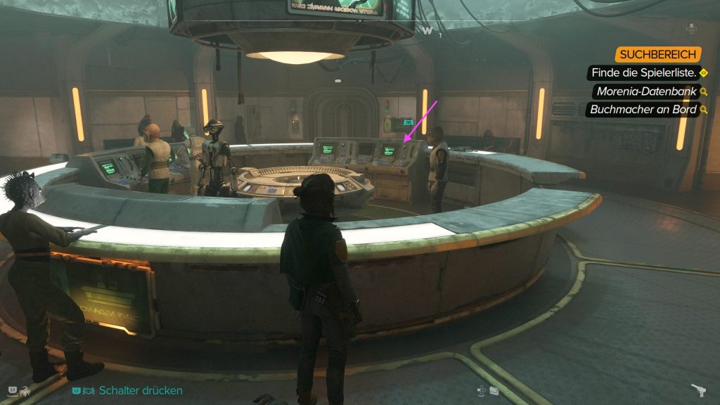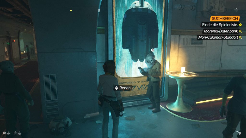 Auch der Rodianer beim Spieltisch in der Nähe der Bar weiß etwas über den Buchmacher. Allerdings möchte der Rodianer gesalzene 500 Credits für die Information, dass es sich bei dem Buchmacher um einen Mon Calamari handelt, der außerdem die Spielerliste auf seinem Datenblock hat. Alternativ könnt ihr ND-5 um einen Tipp über den Buchmacher fragen, woraufhin Kay an den Kabinenbereich denkt. Jetzt habt ihr alle Informationen zur Identität und Aufenthaltsort des Buchmachers.