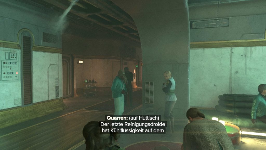 Ihr müsst aber die richtige Putzkraft ausfindig machen. Es gibt mehrere Gesprächssituationen, aber nur eine erfolgsversprechende Variante: Im Aufenthaltsbereich des Kabinentrakts nach dem Fathiere-Rennen-Spieltisch könnt ihr eine weibliche Quarren belauschen, die bei einer Mitarbeiterin eine Putzkraft für die Kabine anfordert.