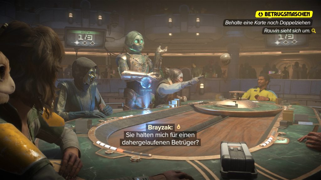 Keine Angst, ihr müsst nicht Profi in Kessel-Sabacc sein, um die Quest erfolgreich zu beenden. Und wenn ihr zuvor auf der Morenia die Schummelzeichen der Sabacc-Betrüger in Erfahrung gebracht habt (siehe oben), ist die Konkurrenz am Tisch in wenigen Runden dezimiert. Verpfeift dann im angezeigten Moment den Cheater an den Spielleiter EY-E9, woraufhin dieser aus dem Spiel geworfen wird.