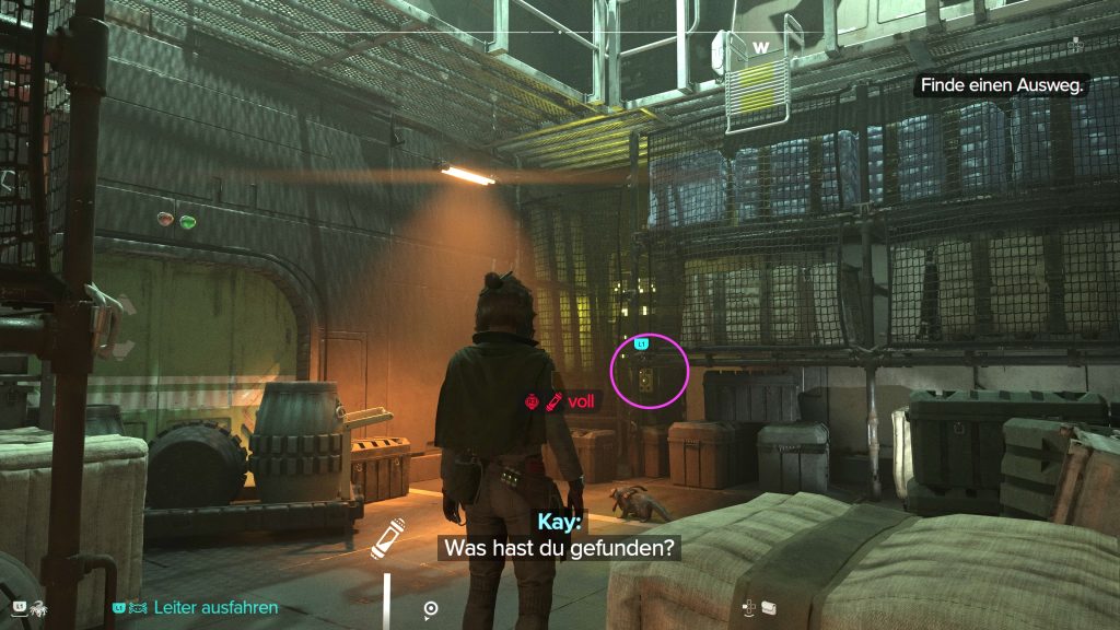 Lasst Nix den an der Wand etwas versteckten Knopf bei den Regalen drücken, um die Leiter herunterzufahren. Klettert dann nach oben auf dem Metallsteg und zieht den Schalter über dem Turbolift. Die Tür zum Turboliftschacht öffnet sich nun und Kay kann an den gelben Haltestangen und Gitter im Schacht immer weiter nach unten klettern. Am Boden des Liftschachts befindet sich ein Behälter mit Herstellungskomponenten zum Mitnehmen. Über den Lüftungsschacht verlasst ihr den Turboliftschacht.