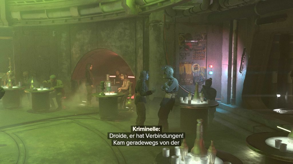 Wenn ihr euch an den Tresen stellt, könnt ihr noch ein anderes interessantes Gespräch zwischen zwei Gästen belauschen: Der Vermittler, der Kay für diesen Job vom Gouverneur angeheuert hat, bestiehlt offenbar Thorden. Mit dieser Information könnt ihr auf dem Weg zum Hangar leicht verdiente 250 Credits vom Broker erpressen.