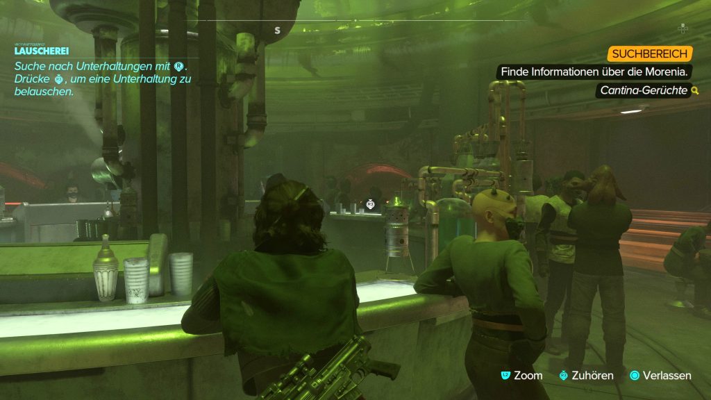Um mehr über das berühmte Luxusraumschiff herauszufinden, erhaltet ihr von Governeur Thorden die Info-Kette „Morenia-Ermittlung“. Begebt euch dazu in die Cantina der Renpalli-Station und setzt euch auf den Stuhl vor der Bar. Jetzt könnt ihr nach interessanten Gesprächen im Lokal lauschen. Interessant für die Quest ist die Unterhaltung eines Rodianers mit einer Kriminellen in der Bar. Die beiden tauschen sich über einen Droiden von der Morenia aus, der sich gerade auf der Renpalli-Station zum Einkaufen aufhält.