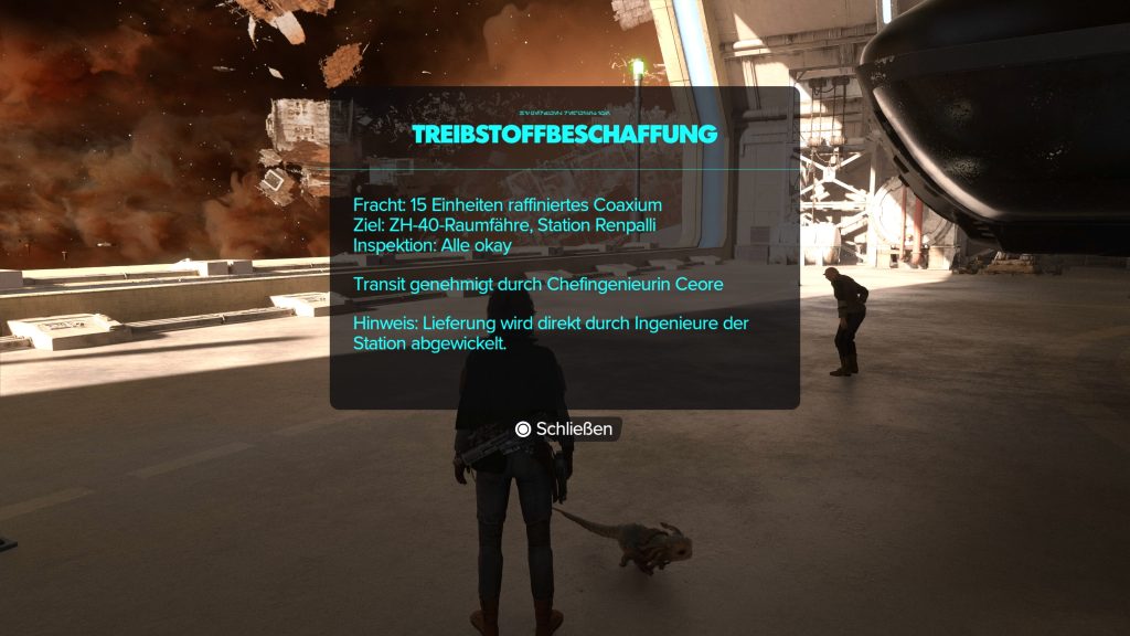 Schließlich gibt es noch Informationen über einen illegalen Treibstoffhandel mit dem Morenia-Droiden, die sich auf dem Datenblock der Chefingenieurin befinden sollen. Ihr findet Ceore in der Nähe bzw. vor dem Cockpit der Bahnbrecher. Bestecht die Chefingenieurin entweder gleich mit Credits oder versucht einen Bluff. Da ihr nicht der Droide seid, scheitert aber der Bluff. Schickt Nix dann für einen Taschendiebstahl los, um den Datenblock „Treibstoffbeschaffung“ aus der Tasche von Ceore zu stehlen. Ihr erhaltet dann das Beschaffungsformular für Hypertreibstoff (Questgegenstand).