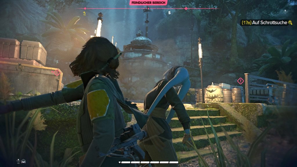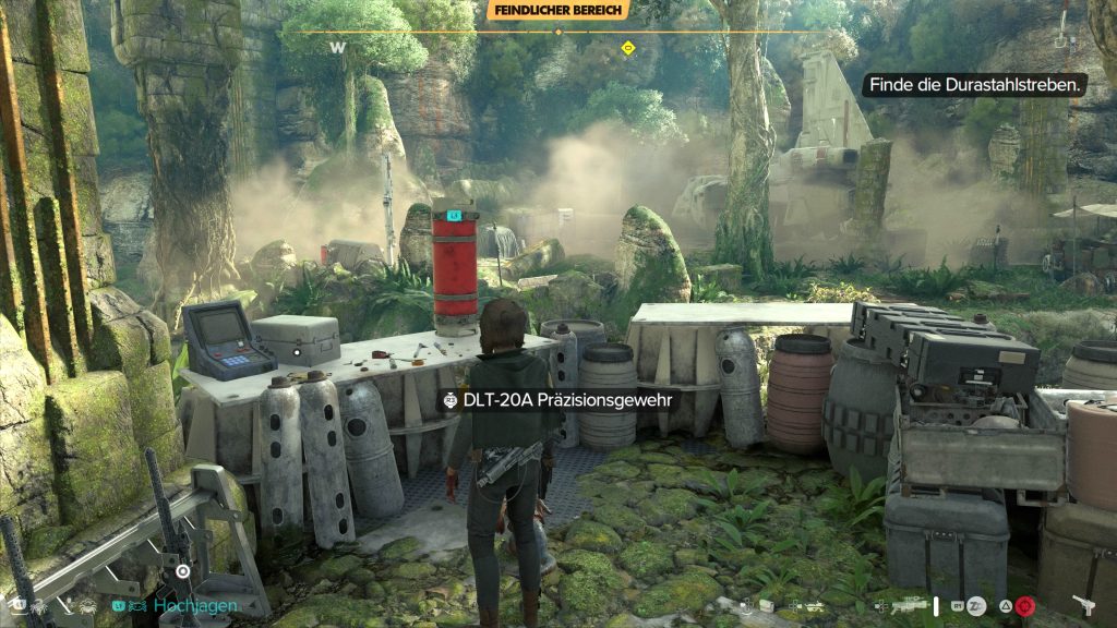 Auch der Landeplatz des Shuttles liegt mitten in einem zugangsbeschränkten Bereich. Erobert das Gelände, damit ihr das Raumschiff mit den Durastahlstreben plündern könnt. Wenn ihr zuerst die gegenüber dem Shuttle gelegene kleine Anhöhe einnehmt, findet ihr dort einen Waffenständer mit mehreren temporären Blaster-Gewehren, um die Söldner beim Shuttle damit zu erledigen. Ihr könnt an den Felsen zur Anhöhe hochklettern.