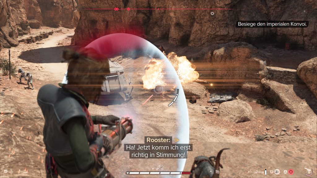 Ein Konvoi des Imperiums soll Roosters Vergeltung zu spüren bekommen. Macht euch mit der schweren Z-6 Rotationskanone und dem Schutzschild des Geschützes vertraut.