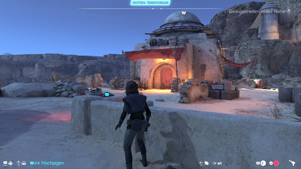 Das Lagerhaus liegt im Huttenkartell-Territorium. Wie üblich ist das Leben wieder deutlich angenehmer, wenn ihr aktuell einen guten Ruf bei den Hutten genießt. Dann könnt ihr euch zumindest innerhalb des Huttenkartell-Außenpostens frei umsehen. Der Datenblock mit Informationen über die Revolverheldin befindet sich aber im zugangsbeschränkten Bereich innerhalb des viereckigen Huttenkartell-Lagerhauses.