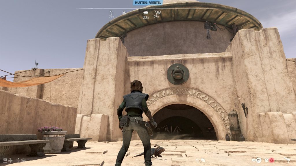 Hier ist die erste Möglichkeit. Betretet Jabbas Stadthaus im Hutten-Viertel in Mos Eisley mit dem Eingang in Form eines Torbogens und schaut euch im Inneren nach einem Lüftungsschacht an der Wand um. Der Schacht führt in den zugangsbeschränkten Teil des Gebäudes. Sucht dort angekommen nach einer Tür, die von einer Überwachungskamera abgeschirmt wird.
