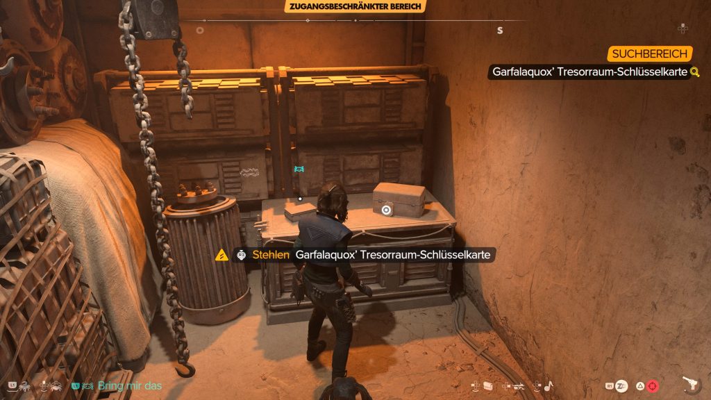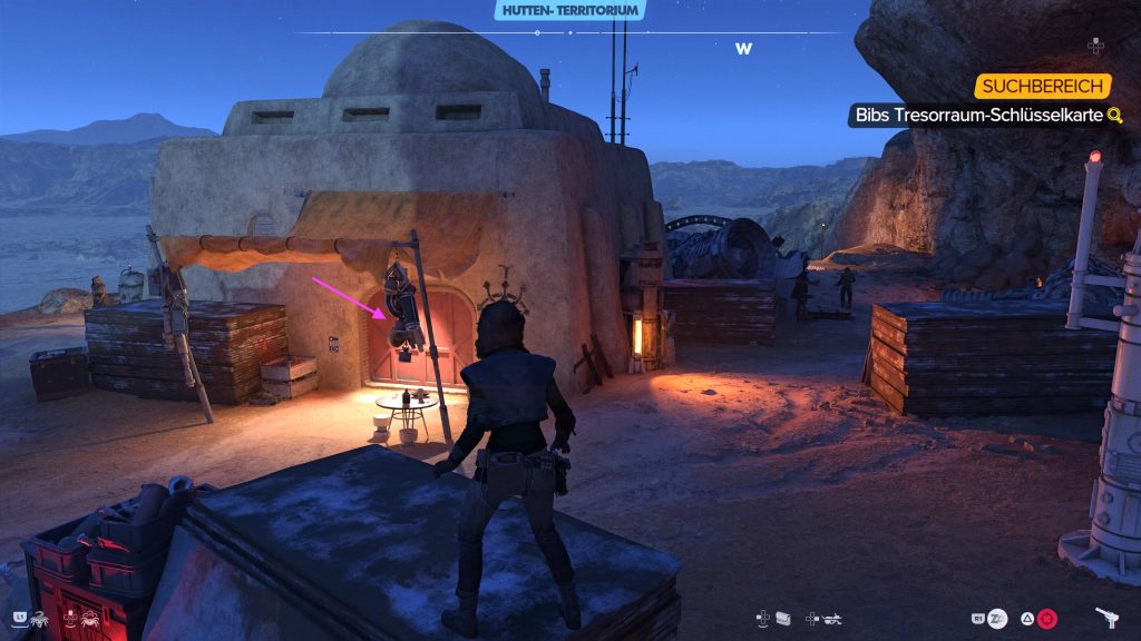 Die Schlüsselkarte von Bib Fortuna befindet sich im Außenposten „Hutten-Schlafbaracke“ in der Wüstental-Region von Tatooine. Auch wenn ihr euch wegen eines guten Rufs frei in Hutten-Territorien bewegen könnt, ist das Betreten des Lagerhauses, ohne dabei von den Wachen beim Einbruch beobachtet zu werden, unmöglich. Legt also zuerst die Wachen mit einer direkten Sichtline auf die Tür des Lagerhauses und auch die in der Nähe patrouillierende Wache zum Schlafen. Knackt dann zügig die Tür, klaut Bibs Schlüsselkarte auf der Werkbank und verschwindet.