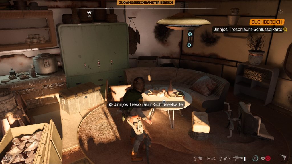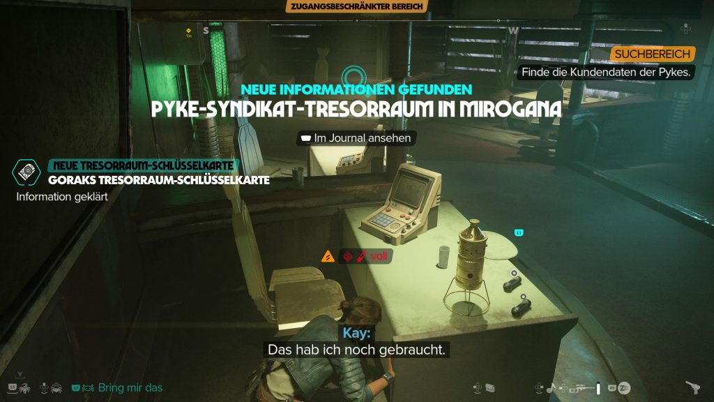 Öffnet mit den drei Schlüsselkarten den Pyke-Syndikat-Tresorraum. Dort findet ihr 5000 Credits, die Sabacc-Kontrollkarte „Spezialzoll“, einen neuen Gleiter-Anstrich sowie nützliche Herstellungsmaterialen.