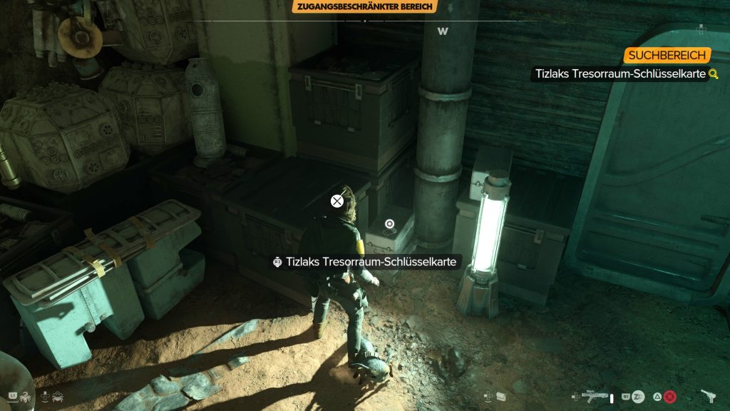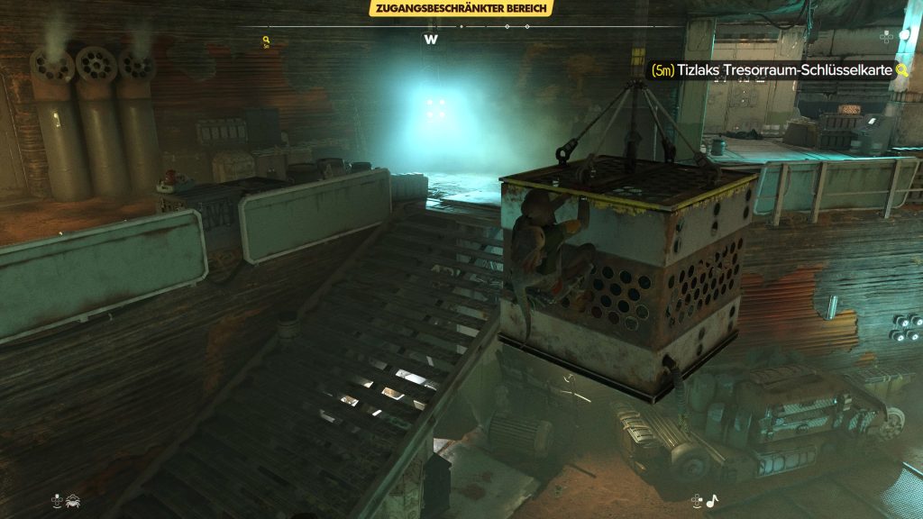 ..findet ihr in der Werkstatt des Pyke-Syndikats in der Region „Die Luftspiegelung“ von Toshara. Für Spieler mit zu schlechtem Ruf beim Syndikat gibt es am Südhang des Bergs einen direkten Hintereingang in die Werkstatt. Lasst Nix in der Werkstatthalle mit den Raumschiffen den Kran-Button drücken, während sich Kay an die Box hängt. Die Box wird dann zur Plattform mit Tizlaks Tresorraum-Schlüsselkarte und einer der Schatztruhen in der Werkstatt gefahren.