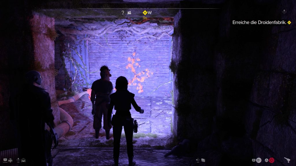 Ab jetzt bekommt ihr es mit mehreren Gegnern zu tun. Entweder greift ihr die Söldner direkt an, legt sie nacheinander leise um oder nutzt den niedrigen Gang beim Bodengitter, der unter den Feinden verläuft. Habt ihr auch den zweiten Raum gesäubert, erreicht ihr das Rebellenversteck in der alten Droidenfabrik.
