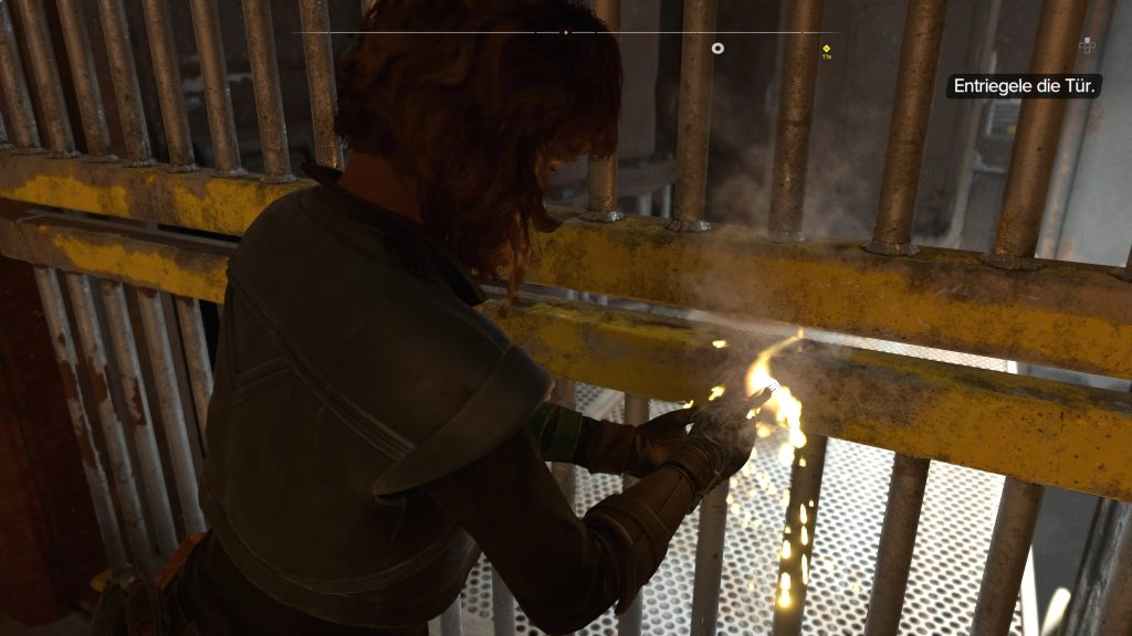 Springt durch die Bodenluke und schneitet das nächste Metallgitter wieder mit dem Fusionsschneider durch. Ein paar Meter weiter schickt ihr Nix in den Seitengang, um die Tür vor der Fabrik von der anderen Seite zu öffnen. Knackt das Schloss der Tür in der Nähe, damit Kay wieder zu den Begleitern stoßen kann. Ihr erreicht das geschlossene große Eingangstor der Droidenfabrik. Jetzt wird es wieder akrobatisch, um den Kontrollraum neben dem Eingangstor zu erreichen.