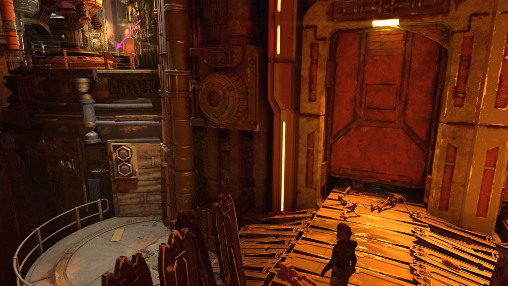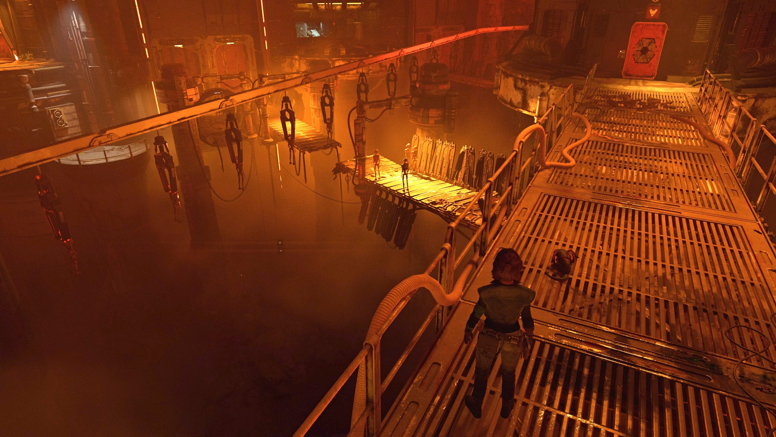 Wenn ihr den Turbolift-Computer aktiviert habt, tauchen Zerek-Besh-Vollstrecker in der Droidenfabrik auf. Die Tür hinter euch funktioniert jetzt wieder, verschwindet in den Raum dahinter. Springt über den Abgrund und klettert an den gelben Griffstangen der Metallsäule und an den gelben Gittern hoch auf die oberste Ebene.