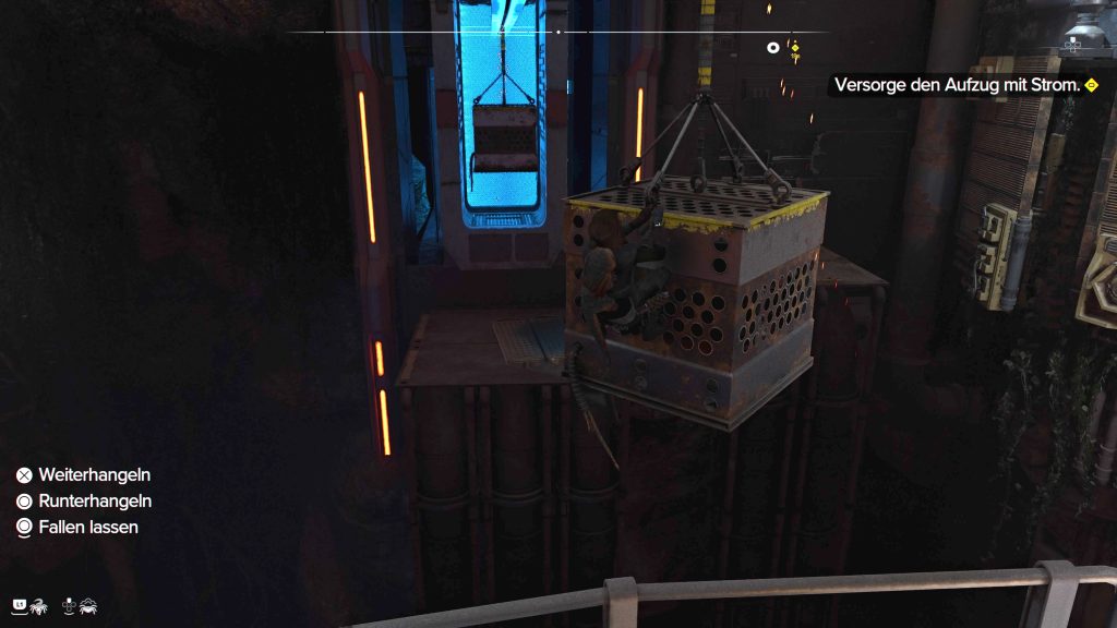 Die Konsole wird von zwei Generatoren mit Energie versorgt. Springt und hangelt euch bei der Konsole immer weiter nach links bis zu einem Lüftungsschacht. Kriecht in den Schacht, klettert die Leiter dahinter nach unten und lauft durch das Metallrohr bis zum ersten Generator. Schaltet den ersten Generator ein und fahrt mit dem Lift daneben nach unten.