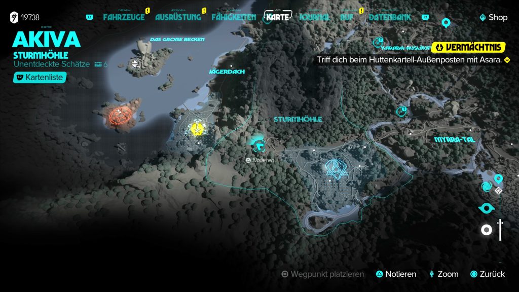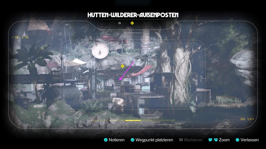 Für den Treffpunkt mit Asara sucht ihr nach dem Pfad bergauf in der Nähe der Hutten-Nachschubstation. Klettert den Fels nach oben zum Aussichtspunkt mit Asara. Verschafft euch auf dem Hügel einen Überblick über den Hutten-Außenposten mit den Käfigen. Unterhalb des Hügels gibt es einen Ast für Kays Greifhaken, an dem ihr euch abseilt. Ihr betretet den zugangsbeschränkten, streng bewachten Bereich des Hutten-Lagers.