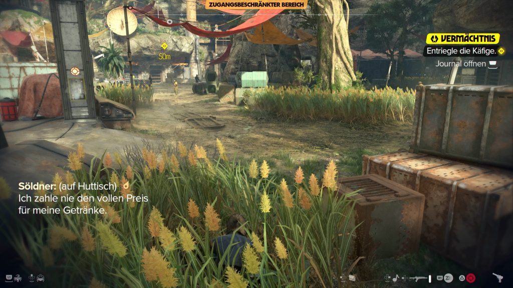 In der Umgebung gibt es mehrere hohe Gräser, in denen ihr euch verstecken und die ersten Wachen unbemerkt auf dem Weg zu den Käfigen in der Höhle mit den Geiseln umlegen könnt.