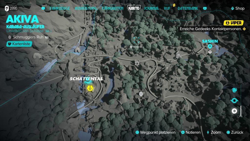 Nähert euch vom Ort Sashin aus dem im Westen gelegenen Treffpunkt im Schattental von Akiva. Seid ihr bei den Wasserfällen angekommen, bemerkt ihr ein abgestürztes Raumschiff im Wasser. Macht euch kampfbereit, bevor ihr das Raumschiff untersucht: die Bakta-Fläschchen liegen nicht ohne Grund um das Raumschiff herum verstreut. Sobald ihr euch das Raumschiff näher anseht, taucht ein aggressiver Viper-Droide bei den Wasserfällen auf. Ihr werdet sofort angegriffen.