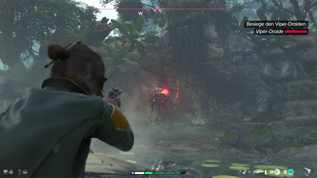 Schaltet zuerst den Schild der fliegenden Maschine mit dem Ionen-Modul des Blasters aus. Kaum habt ihr den ersten Gegner besiegt, tauchen viele weitere schwebende Vipern-Droiden auf der Bildfläche auf. Aber dieses Mal erhält Kay Unterstützung durch eintreffende Infanteristen der Rebellenallianz.