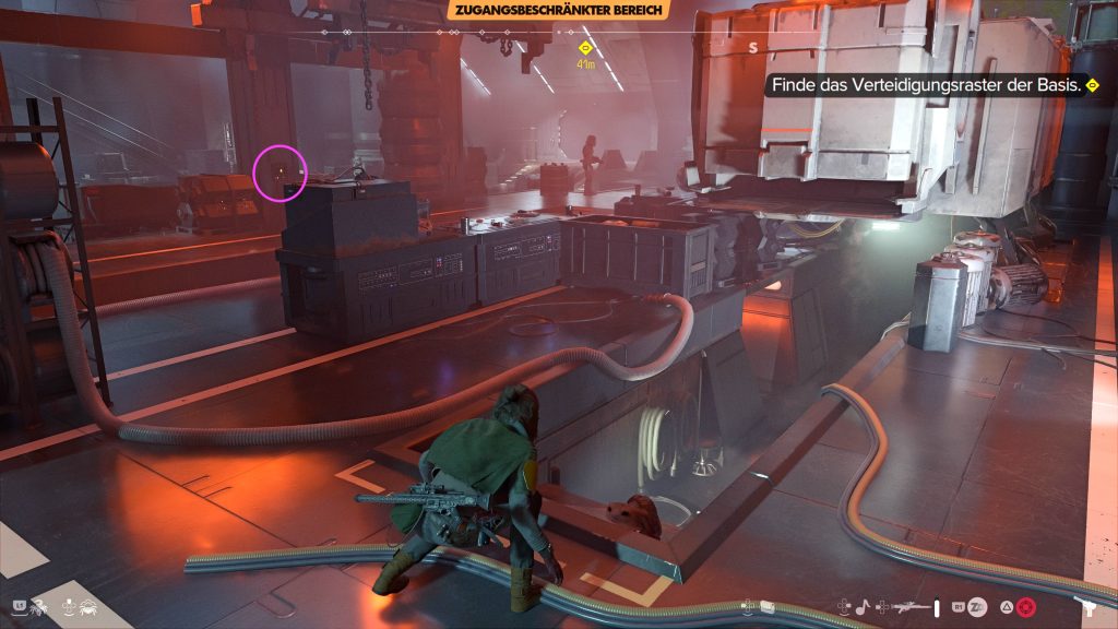 Am Ende des Tunnels schießt ihr mit dem Ionen-Blaster auf die Spule in der Wand, um den Lüftungsschacht rechts daneben zu öffnen. Klettert im Lüftungsschacht die Leiter hoch. Ihr erreicht die bewachte Plattform gegenüber der Landeplattform mit einem gelandeten imperialen Shuttle. Es gibt hier genügend Deckungsmöglichkeiten, um euch von den Wachen ungesehen und ohne Großalarm bis zum Turbolift des Außenpostens zu schleichen.
