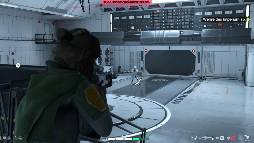 Habt ihr das Imperium erfolgreich abgewehrt, öffnet ihr mit der Konsole oben auf der Galerie die Sicherheitstür für ND-5. Gebt ihm von oben Feuerschutz von der Galerie mit einem Präzsionsgewehr vom Waffenständer, vor allem gegen den hereinstürmenden Deathtrooper. Folgt anschließend dem umprogrammierten Alpha-Viper-Droiden durch die Anlage und helft den Rebellen im Hangar des Kassina-Außenpostens gegen die verbleibenden Kräfte des Imperiums.